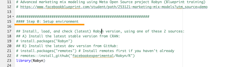 복사한 스크립트를 보면 아래 표시해놓은 부분 처럼 Step 들이 있습니다. 로빈을 실행하고 결과를 뽑아보기까지 중요한 단계들을 구분해놓았다고 보면 됩니다. 이번 글에선 Step 0 부터 Step 1 까지 해볼거에요.